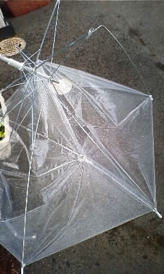 つい数分前、愛犬萌を散歩に連れていたところ急に雨が降り出し、慌てて開いたビニ傘の命は、1分も持ちませんでした。上記の写真は、そのなれの果てで御座います。